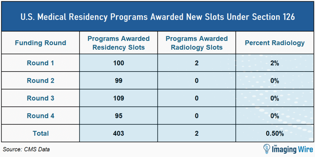 A federal push to alleviate the U.S. physician shortage by adding more resident training slots appears to have skipped radiology. Of the more than 400 residency programs awarded funding so far, only two diagnostic radiology programs got funds.